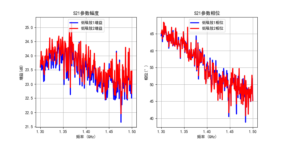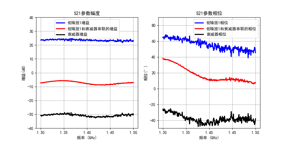(低噪放 1 和衰减器串联的增益 dB)减去 (衰减器的增益 dB)即可得到低噪放 1 实际的增益。实际上是用(低噪放 1 和衰减器串联的 S21 复数)除以 (衰减器的 S21 复数)得到(低噪放 1 的 S21 复数),从而得到低噪放 1 的增益(复数的幅度)和相位(复数的相位)。