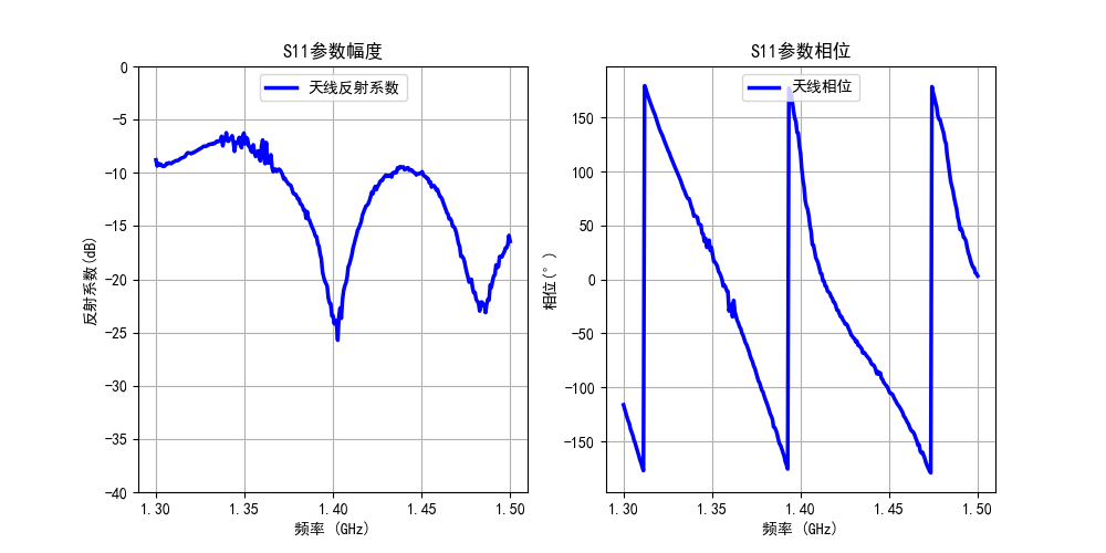 天线馈电点引出了约 1.2m 长度的同轴线,这是 S11 的相位变化的主要来源;从矢网发出的信号经过 1.2m 的长度到天线馈电点,由于阻抗不匹配被部分反射回来,折返经过 1.2m 的长度返回矢网,总计 2.4m 的长度。从图中也可看出从 1.3114GHz 到 1.3907GHz(总计 0.0793GHz 的带宽)上,相位从 180° 变化到 - 180°(总计 360° 的变化,即)。