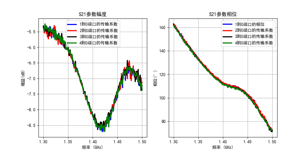 目前使用的 200 元购入的 NanoVNA 矢网,最大的测量频率为 1.5GHz,计划在 1425GHz 附近观测,因此只测量各器件在 1.3GHz-1.5GHz 的性能。把 NanoVNA 连接到电脑,使用 NanoVNA-Saver 软件扫描、导出各参数,然后利用 python 进行分析。