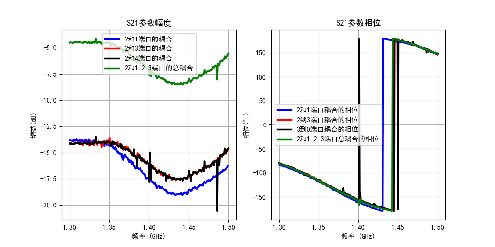 一般情况下,功分器 / 合路器都是按照所有分路都工作情况下设计的,4 个分路需要同时激励来观测总的传输系数,或者尝试得到这个功分器 / 合路器的 S 参数矩阵(4 个分路 + 1 和合路,5*5 的矩阵)。目前仅有 2、3 端口被使用,1、4 端口开路,所以难以做出实际工作状态的详细判定,不过有一点可以确定,信号经过 2、3 端口的插损、相位变化肯定基本上是接近的。