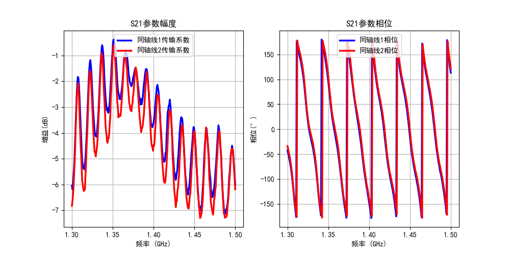 两者的 S21 参数基本一致,可看出从 1.3114GHz 到 1.3408GHz(总计 0.0294GHz 的带宽)上,相位从 180° 变化到 - 180°(总计 360° 的变化,即)。利用群时延公式,有,即矢网的信号从发出到返回总共花费了 34.014ns,同轴线中的光速为,因而可以估出信号走过的长度为,接近 8m 长度。