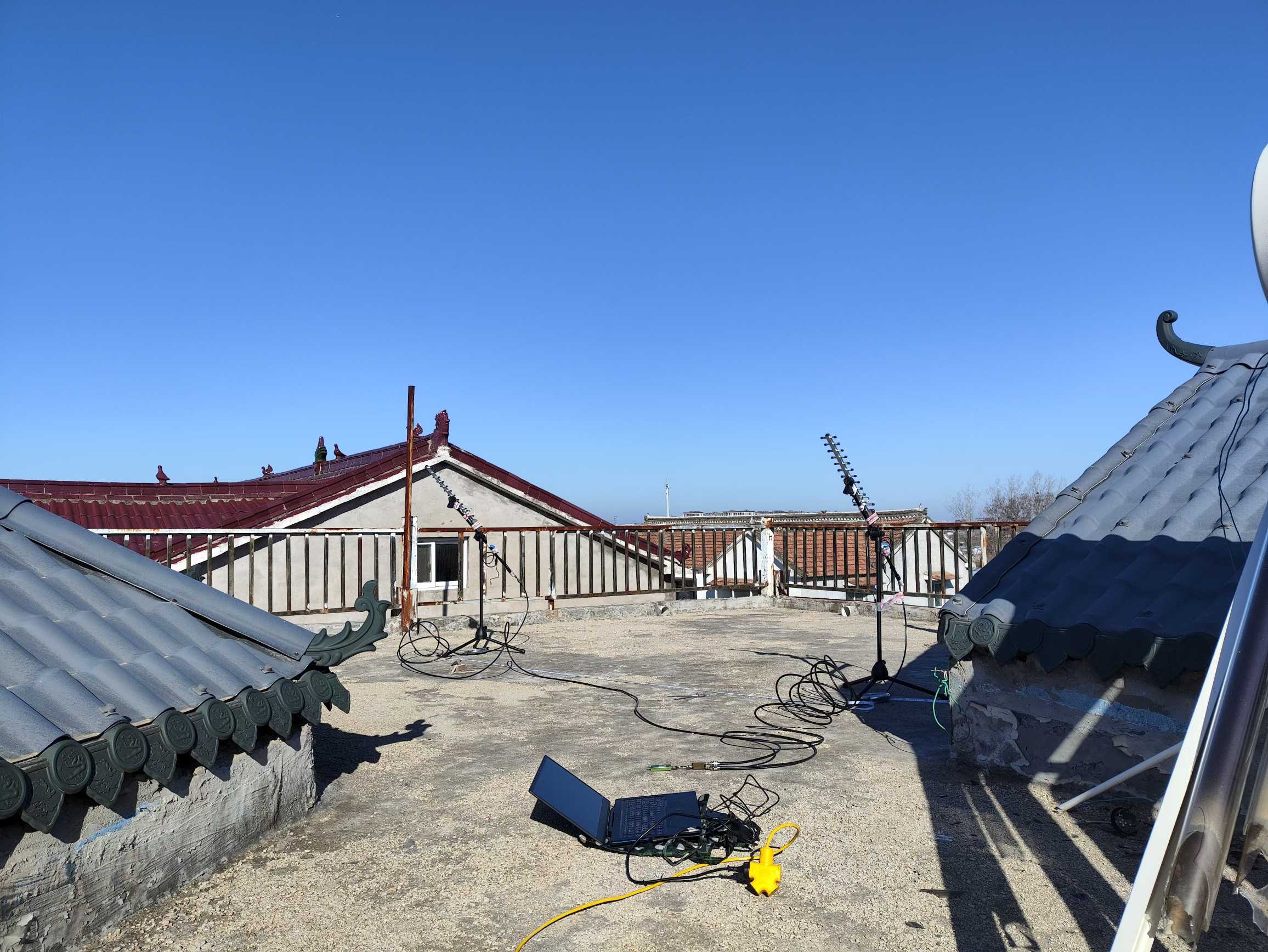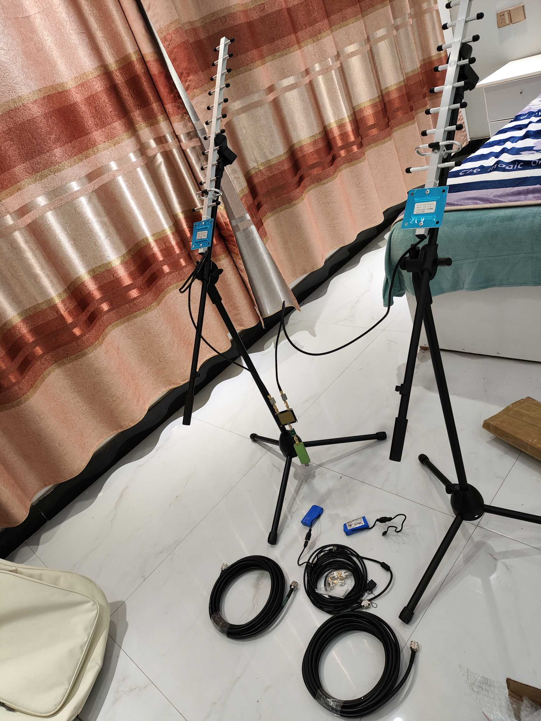 实际连接设备如下图,由于需要将天线拉开,在低噪放和合路器中间加上了长度为 8m 的同轴线,电池被绑在支架上给低噪放供电。