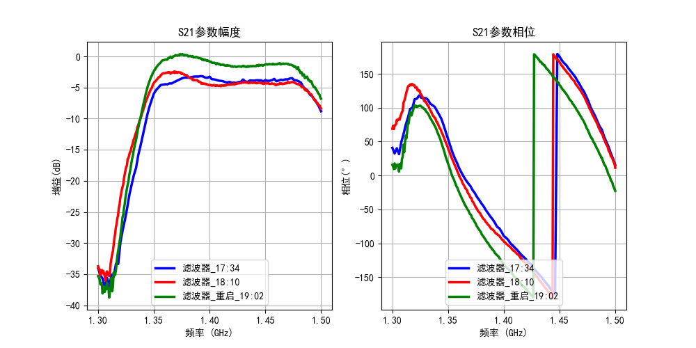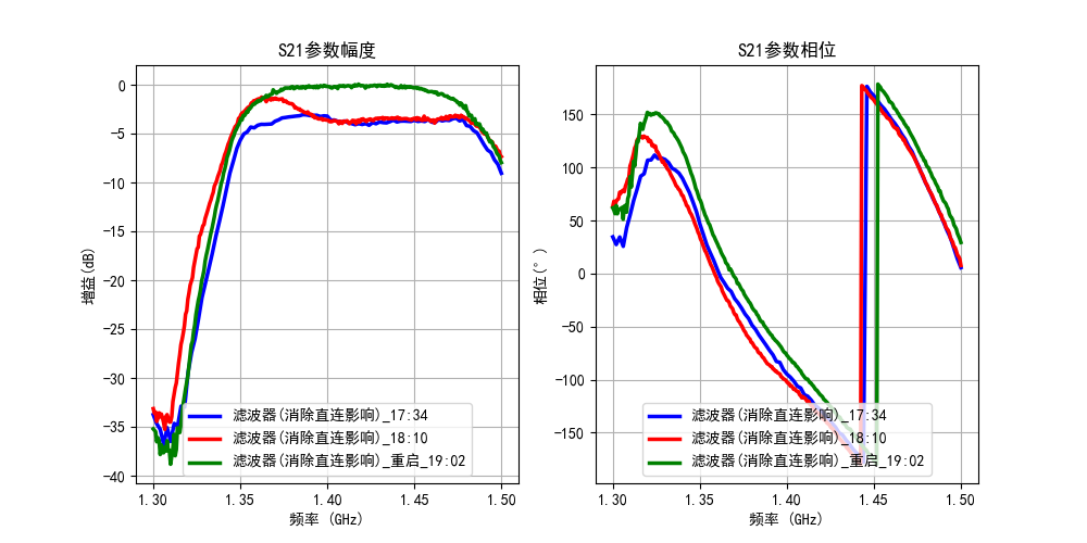 用在 17:34、18:10、19:02 对滤波器测量的 S21 参数(复数形式)分别除以 在 17:31、17:57、19:00 直连的 S21 参数,尝试手动定标消除时间漂移的影响如下图