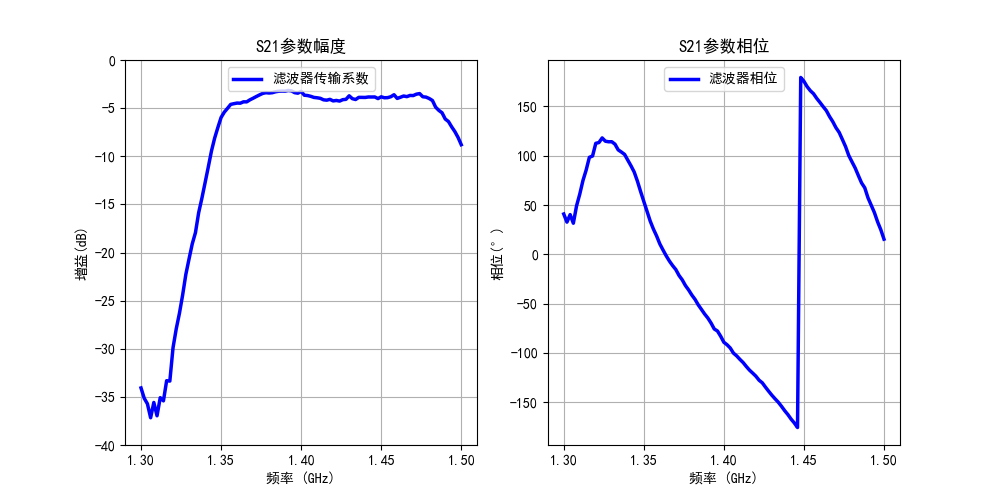 可以看出滤波器在不同频带上的群时延可能不同, 不过由于主要工作在 1.35GHz 和 1.48GHz 上,因此我们只需要估计工作频带内的群时延。在 1.35GHz 到 1.45GHz 上,相位由 50° 变化到 - 180°,因此 ,即矢网的信号从发射端口到接收端口总共花费了 6.39ns,同轴线中的光速为,因而可以估出信号走过的长度为(假设等效到 RF-4 板材上,RF-4 板材上的光速约为真空中光速中的一半),即滤波器等效长度为 0.9585m。