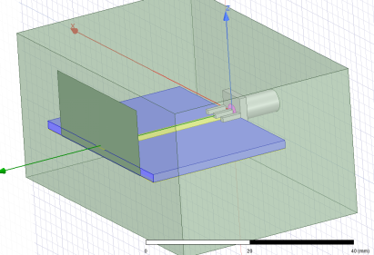 下面进行同轴线转微带线的仿真,如图 21 所示,深蓝色的底板为 FR-4,厚度为 1.6mm,介电常数为 4.4,介质损耗角正切为 0.02。银色的为偏脚 SMA 接头,其中粉红色的介质为 teflon,而黄色的线则宽度为 3mm 的微带线。
