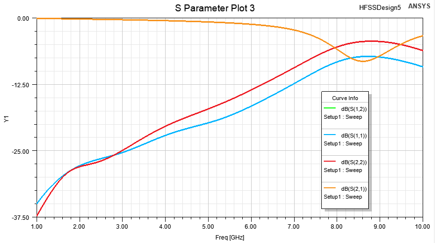 在此微带线的宽度固定为 3mm,实际上为了取得更好的 S 参数,可以对一条微带线的不同段的宽度进行优化,从而获取更好的 S 参数。
