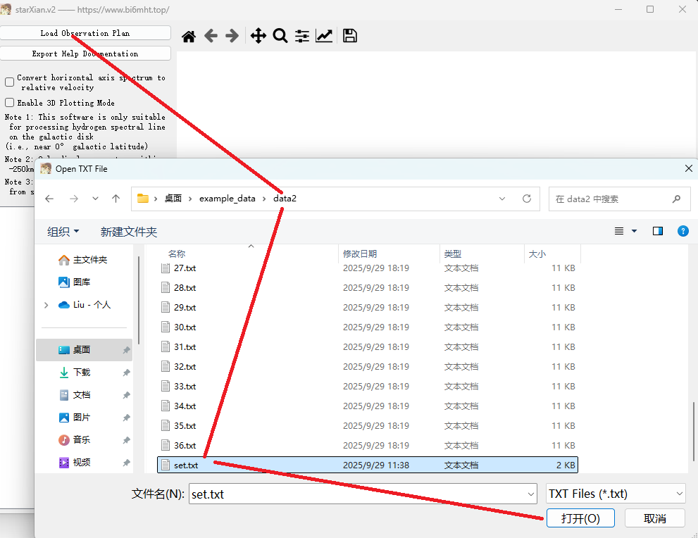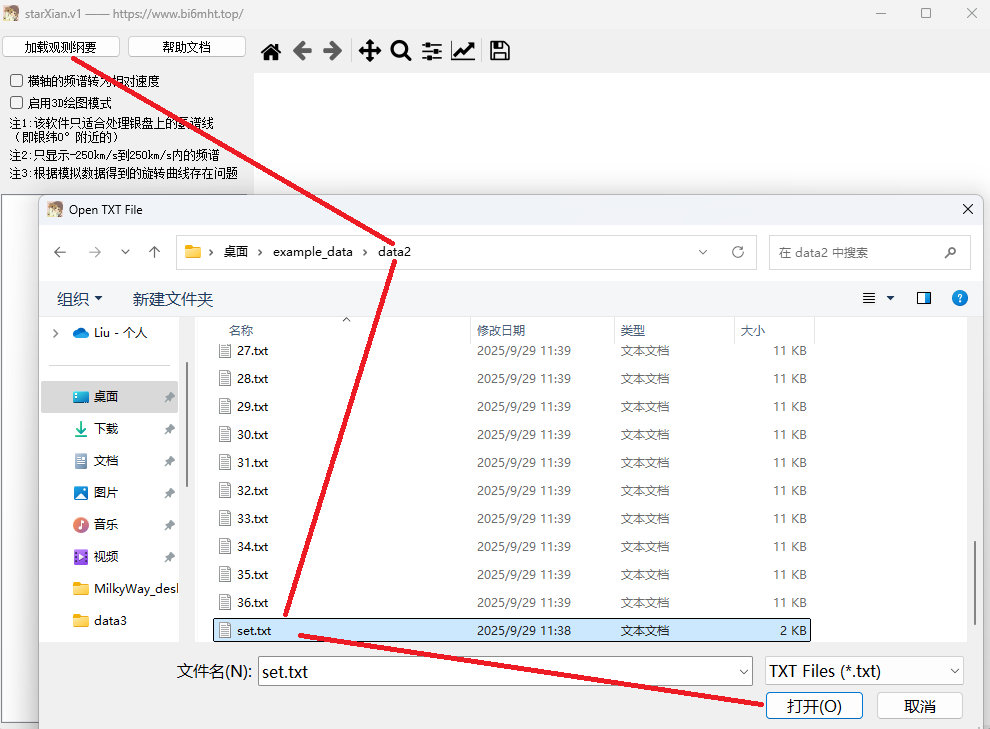 打开软件,点击加载观测纲要文件,选中示例数据 data2 文件夹中的 set.txt,如下图所示