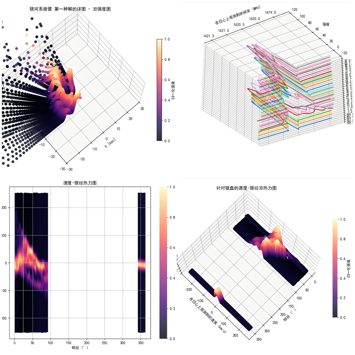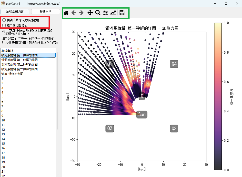 加载后会出现若干选项,如下图所示,分别为银河系旋臂详图、简图(只画出了旋臂散点)、旋转曲线、每个文件频谱图的绘制,点击即可显示出来;也可以右击绿框内的控件,对图片进行放大、存储、复原等操作。
