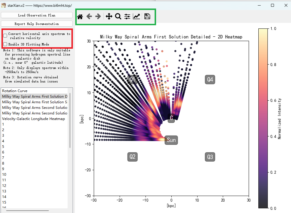 After loading, several options will appear as shown below: detailed Milky Way spiral arms diagram, simplified diagram (only showing spiral arm scatter points), rotation curve, and spectrum plots for each file. Click to display them; you can also right-click the control in the green box to zoom, save, restore, etc.