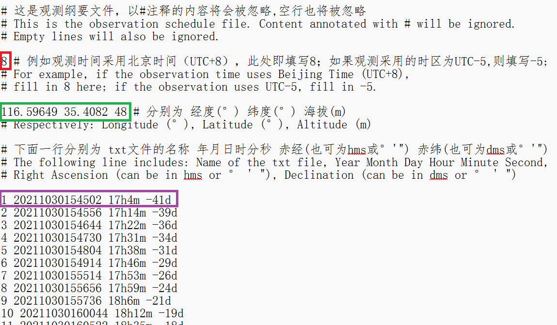 Add timezone information at the beginning of the observation plan file (red), for example, if observation time uses Beijing time (UTC+8), fill in 8 here; if observation uses UTC-5 timezone, fill in -5.